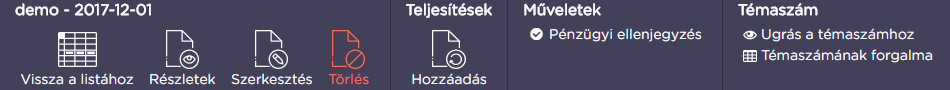 Végezhetünk módosításokat is: a szerkesztés gombra kattintva a teljesítés értékén, a számla adatain, a szervezeti elszámoláson és a címkéken is változtathatunk, valamint – tény állapot rögzítéséhez – megadhatjuk a pénzügyi teljesítés napját. Az átvezetéssel az elszámolásban érintett témaszámok változtathatók; végül pedig törölhetünk meglévő teljesítést vagy – a Hozzáadásra kattintva – vehetünk is fel újat.