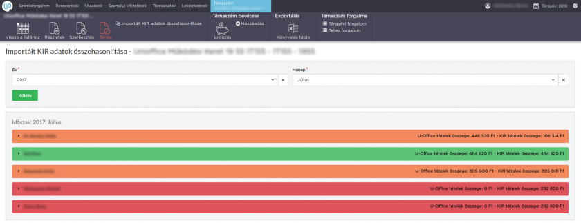 - zölddel jelzi azokat a tételeket, ahol az U-Office-ban és a KIR-ben lévő összegek megegyeznek, így a két nyilvántartás megegyezik.
