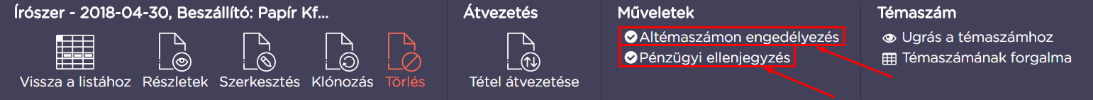 Megfelelő jogosultság birtokában a Műveletek menüpontban az arra jogosultnak lehetősége van a tétel pénzügyi ellenjegyzésére, illetve, ha a tétel altémaszámra lett rögzítve, altémaszámon engedélyezésére. Ezek a műveletek ugyanezen a felületen vissza is vonhatók.