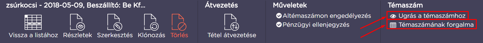 A már létrehozott beszerzések valamelyikének részleteit megtekintve egy új felső menüt láthatunk, új lehetőségekkel. A Szerkesztés, a Klónozás és a Törlés szokásos funkcióin túl elérhető az Átvezetés is, melynek segítségével a beszerzésünk egy másik témaszámra, altémaszámra terhelhető. (Az átvezetésről további információk itt.)