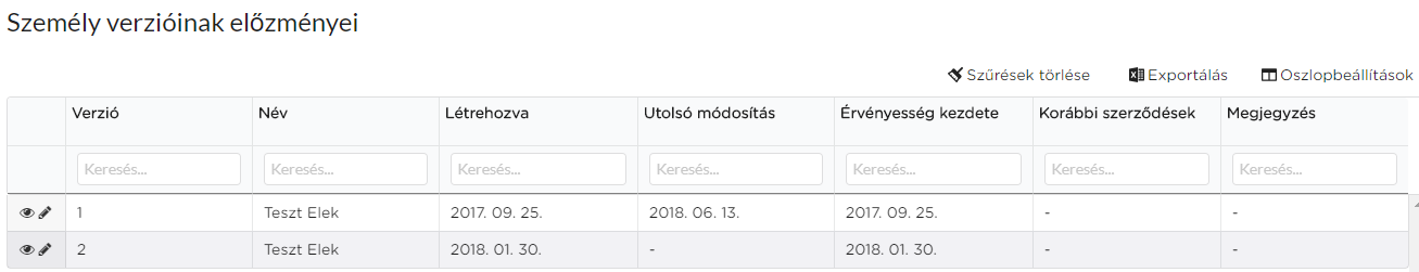 A személy verziói gomb (8. ábra) megnyomása után, egy listában (9. ábra) láthatjuk a személy történetét a cégnél. Melyik időszakban milyen aktuális adatai voltak, milyen szerződéssel rendelkezett. A személy korábbi verziói is visszanézhetőek, megnyithatóak (kis szem ikon), ellenőrizhetőek a különbségek. Minden verziónak a szerkesztésére (ceruza ikon) van lehetőség a későbbiek folyamán is.
